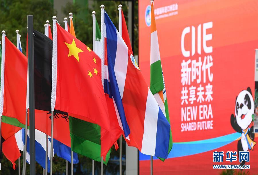 11月5日,在上海國家會展中心入口處,旗幟迎風(fēng)飄揚。新華社記者 李賀 攝