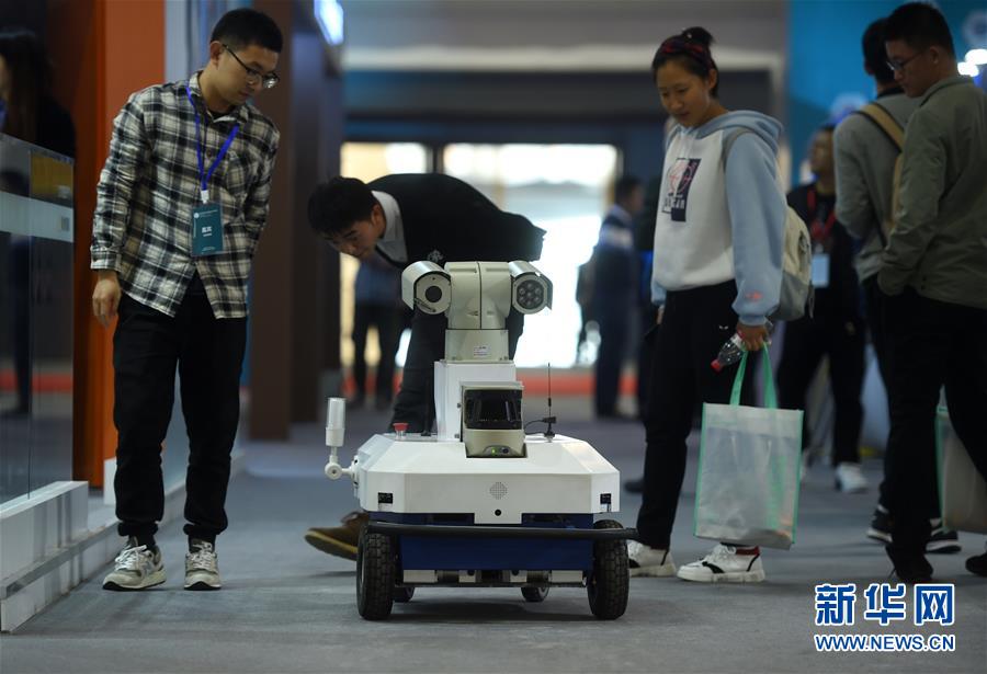 11月10日,人們?cè)谡箷?huì)現(xiàn)場(chǎng)觀看展出的一款電力巡檢機(jī)器人。