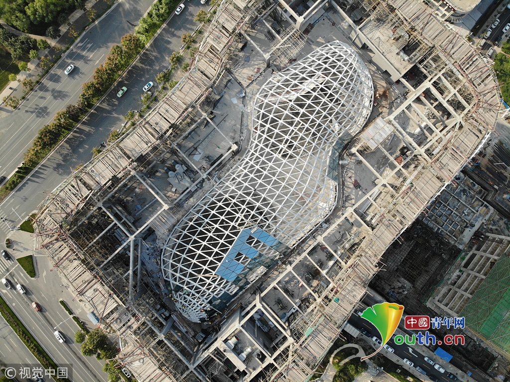 2018年10月13日,河南鄭州,龍子湖湖心島上的一棟在建大樓頂部設計為鏤空的框架結(jié)構(gòu),俯瞰酷似一顆巨大的花生。