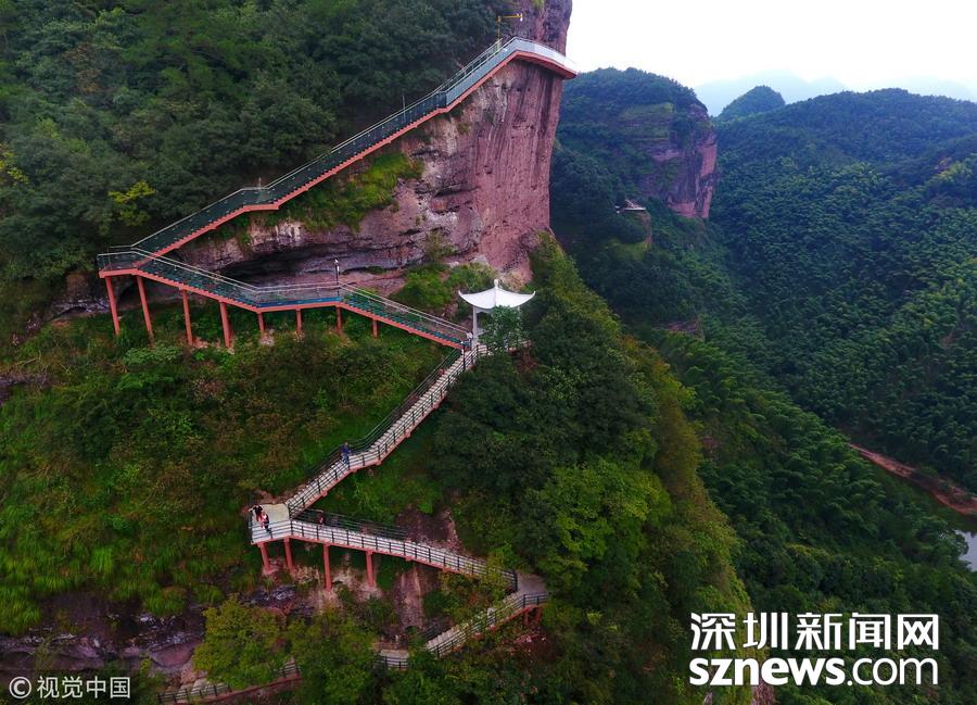 深圳新聞網(wǎng)訊 2018年6月19日,航拍江西贛州南武當山百米高空玻璃棧道。棧道緊貼峭壁,在懸崖之上凌空蜿蜒穿行,猶如一條玉龍盤旋在綠林石海之中。 南武當山位于江西最南端的龍南縣武當鎮(zhèn)境內,景區(qū)核心面積達到13.5平方公里,擁有99座千姿百態(tài)的巍峨石峰,丹霞地質風貌突出,連綿十里,被稱為“武當十里畫廊”。