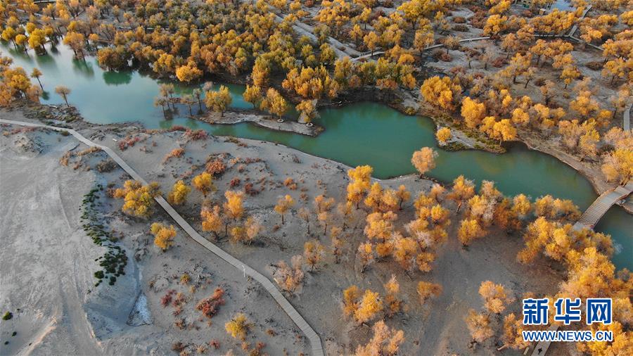 這是在內(nèi)蒙古自治區(qū)額濟(jì)納旗拍攝的胡楊林(10月10日無人機(jī)拍攝)。 金秋時(shí)節(jié),內(nèi)蒙古自治區(qū)額濟(jì)納旗胡楊林如同披上金裝,成為大漠中的一抹亮色,吸引眾多中外游客前來觀賞游玩。 新華社記者鄒予攝