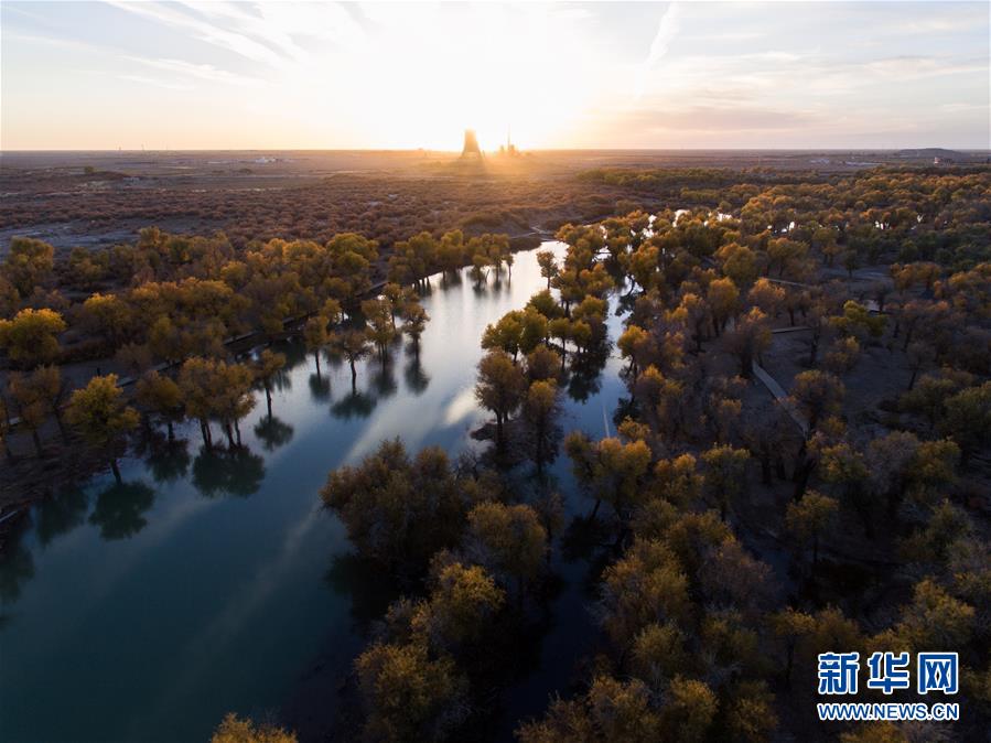這是在內(nèi)蒙古自治區(qū)額濟(jì)納旗拍攝的胡楊林(10月10日無人機(jī)拍攝)。 金秋時節(jié),內(nèi)蒙古自治區(qū)額濟(jì)納旗胡楊林如同披上金裝,成為大漠中的一抹亮色,吸引眾多中外游客前來觀賞游玩。 新華社記者劉磊攝