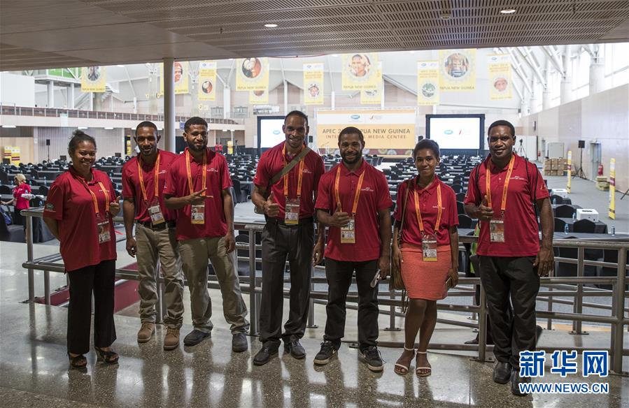 11月13日,幾名工作人員在巴布亞新幾內(nèi)亞首都莫爾茲比港的APEC國(guó)際媒體中心內(nèi)合影。 新華社記者白雪飛攝