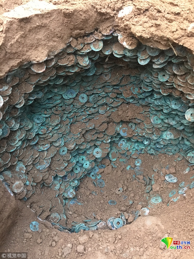 11月9 日中午11 時許,該縣縣城一工地在對地面開挖施工時,發(fā)現(xiàn)地下埋藏有大量古幣,立即報警。警方快速趕到現(xiàn)場進(jìn)行保護(hù)。得知這一信息后,市、縣兩級文物部門工作人員立即趕到,并由專業(yè)考古人員進(jìn)行發(fā)掘。發(fā)掘現(xiàn)場拍攝的照片顯示,這些古幣埋在一個圓形的土坑中。