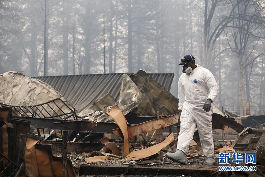 11月13日,在美國(guó)加利福尼亞州天堂鎮(zhèn),搜救人員在山火過(guò)后的廢墟工作。