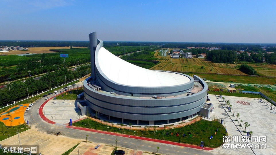 2018年6月13日,航拍河南淮陽一座即將竣工落成的體育場館建筑,市民稱酷似一個石磨盤。