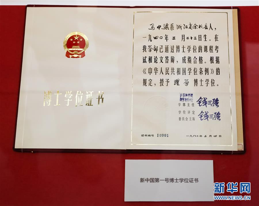 這是在“歷史巨變”展區(qū)拍攝的新中國(guó)第一號(hào)博士學(xué)位證書(shū)(11月15日攝)。