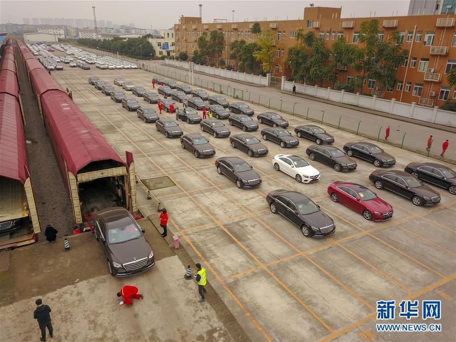 當(dāng)日,首趟中歐班列商品車專用車運(yùn)輸國(guó)際班列搭載的112臺(tái)奔馳品牌進(jìn)口整車在重慶順利完成通關(guān)。