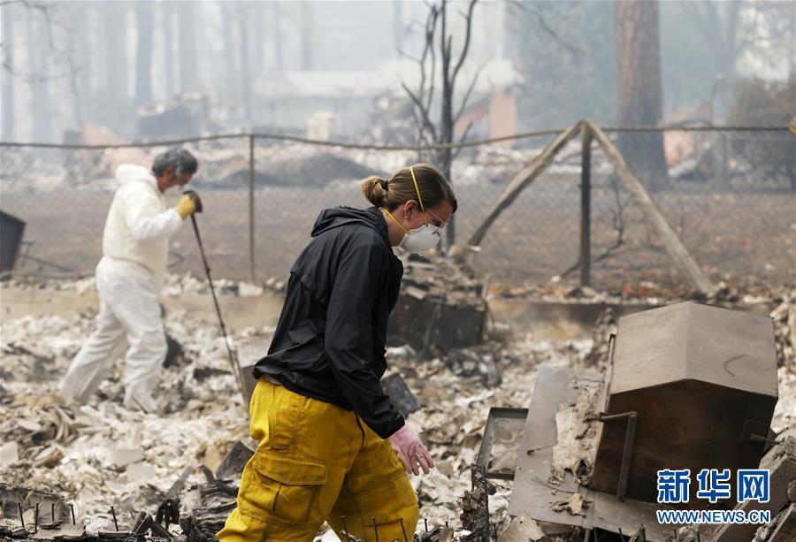 11月19日,在美國加利福尼亞州比尤特縣天堂鎮(zhèn),救援人員在山火廢墟中工作。新華社記者吳曉凌攝