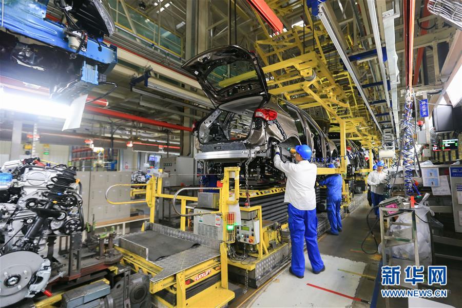 在上汽通用東岳汽車(chē)有限公司的總裝車(chē)間,工作人員在裝配流水線(xiàn)上作業(yè)(11月15日攝)。新華社記者王南攝