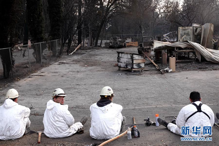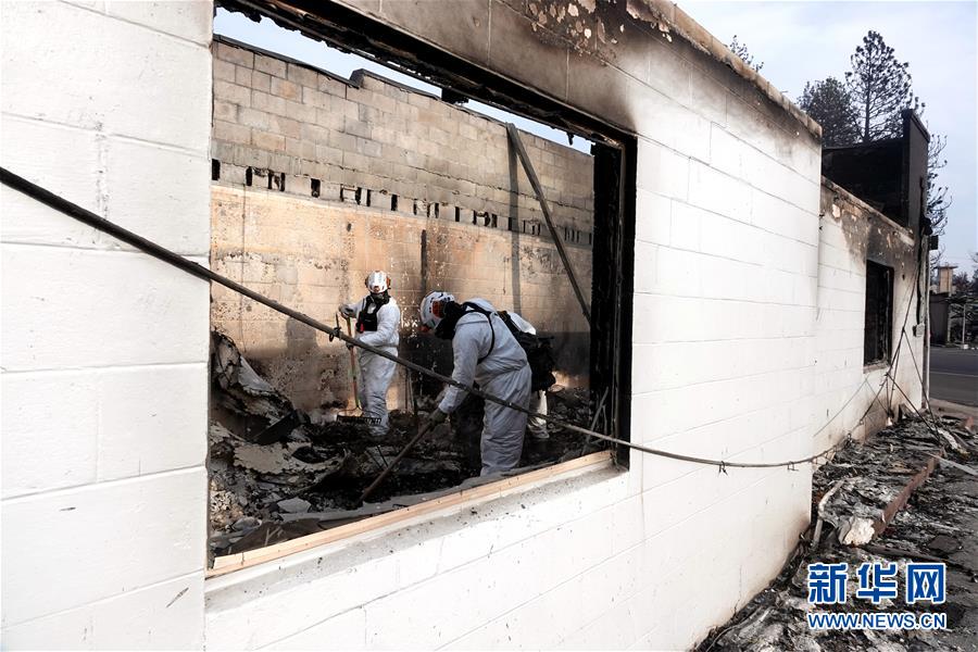 11月20日,在美國加利福尼亞州比尤特縣天堂鎮(zhèn),救援人員在災區(qū)工作。