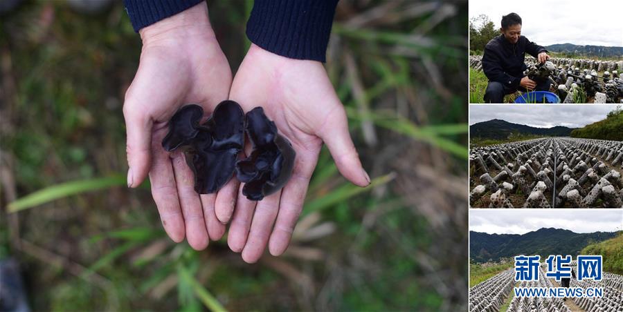 拼版照片:左圖為在大浪鎮(zhèn)上里村,致富帶頭人唐志海手捧剛剛收獲的木耳;右上圖為唐志海在木耳種植基地里采摘木耳;右中圖為木耳種植基地;右下圖為唐志海在木耳種植基地里查看木耳長(zhǎng)勢(shì)(照片均攝于11月18日)。近年來(lái),上里村依靠發(fā)展紅薯、木耳種植,已于2016年實(shí)現(xiàn)脫貧。 廣西融水苗族自治縣是國(guó)家扶貧工作重點(diǎn)縣,全縣“九山半水半分田”,生活生產(chǎn)環(huán)境較為惡劣,脫貧攻堅(jiān)任務(wù)艱巨,目前還有7.68萬(wàn)貧困人口。面對(duì)經(jīng)濟(jì)發(fā)展落后、貧困面廣且程度深的現(xiàn)狀,當(dāng)?shù)匕衙撠毠?jiān)與創(chuàng)新產(chǎn)業(yè)扶持相結(jié)合,依托生態(tài)資源優(yōu)勢(shì),實(shí)施“特色產(chǎn)業(yè)富民行動(dòng)”,通過(guò)發(fā)展特色民族旅游、林下經(jīng)濟(jì)和特色養(yǎng)殖業(yè)等扶貧產(chǎn)業(yè),帶動(dòng)貧困群眾依靠勤勞的雙手,拔窮根摘窮帽,實(shí)現(xiàn)脫貧致富。據(jù)了解,目前全縣貧困戶參與特色產(chǎn)業(yè)發(fā)展的有2.9萬(wàn)戶,扶貧產(chǎn)業(yè)覆蓋率達(dá)95%。 新華社記者 黃孝邦 攝
