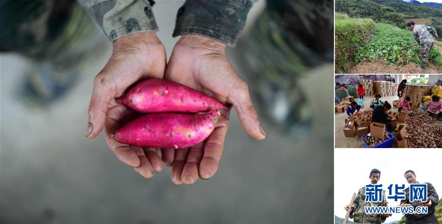 拼版照片:左圖為在大浪鎮(zhèn)桐里村,55歲的韋炳莊手捧剛剛收獲的高山紅薯;右上圖為韋炳莊在地里挖紅薯;右中圖為在縣城一個(gè)電商基地里,工作人員打包貧困戶種植的紅薯,準(zhǔn)備發(fā)往全國(guó)各地;右下圖為韋炳莊(左)在地里挖紅薯(照片均攝于11月18日)。今年,韋炳莊種植3畝高山紅薯,每畝年產(chǎn)3000多斤,他家已于2016年實(shí)現(xiàn)脫貧。 廣西融水苗族自治縣是國(guó)家扶貧工作重點(diǎn)縣,全縣“九山半水半分田”,生活生產(chǎn)環(huán)境較為惡劣,脫貧攻堅(jiān)任務(wù)艱巨,目前還有7.68萬(wàn)貧困人口。面對(duì)經(jīng)濟(jì)發(fā)展落后、貧困面廣且程度深的現(xiàn)狀,當(dāng)?shù)匕衙撠毠?jiān)與創(chuàng)新產(chǎn)業(yè)扶持相結(jié)合,依托生態(tài)資源優(yōu)勢(shì),實(shí)施“特色產(chǎn)業(yè)富民行動(dòng)”,通過(guò)發(fā)展特色民族旅游、林下經(jīng)濟(jì)和特色養(yǎng)殖業(yè)等扶貧產(chǎn)業(yè),帶動(dòng)貧困群眾依靠勤勞的雙手,拔窮根摘窮帽,實(shí)現(xiàn)脫貧致富。據(jù)了解,目前全縣貧困戶參與特色產(chǎn)業(yè)發(fā)展的有2.9萬(wàn)戶,扶貧產(chǎn)業(yè)覆蓋率達(dá)95%。 新華社記者 黃孝邦 攝