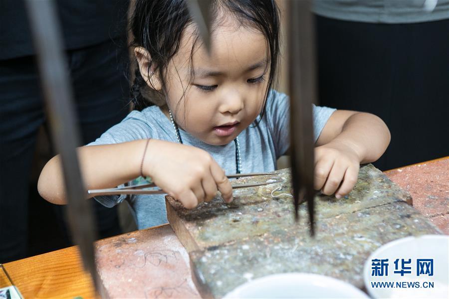8月3日,來自西安的小朋友月白在龍?zhí)栥y飾體驗工作室中學(xué)習(xí)制作銀飾。