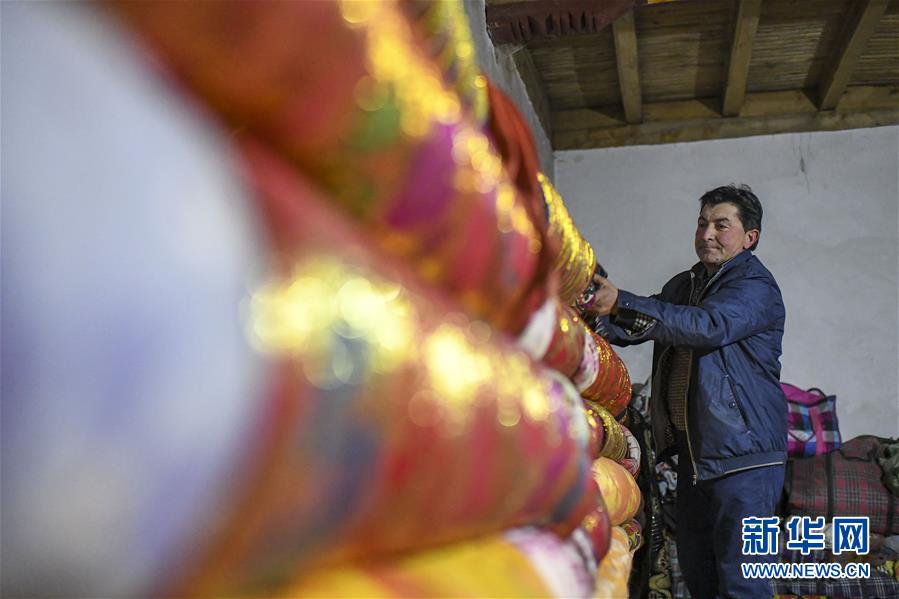 在塔什庫(kù)爾干塔吉克自治縣大同鄉(xiāng)阿克托尕欄桿村一組都熱的舊居中,新縫制好的12床被子放在屋內(nèi),都熱·加爾曼(右)和妻子在門(mén)口談?wù)摪徇w安排(11月16日攝)。新華社記者胡虎虎攝