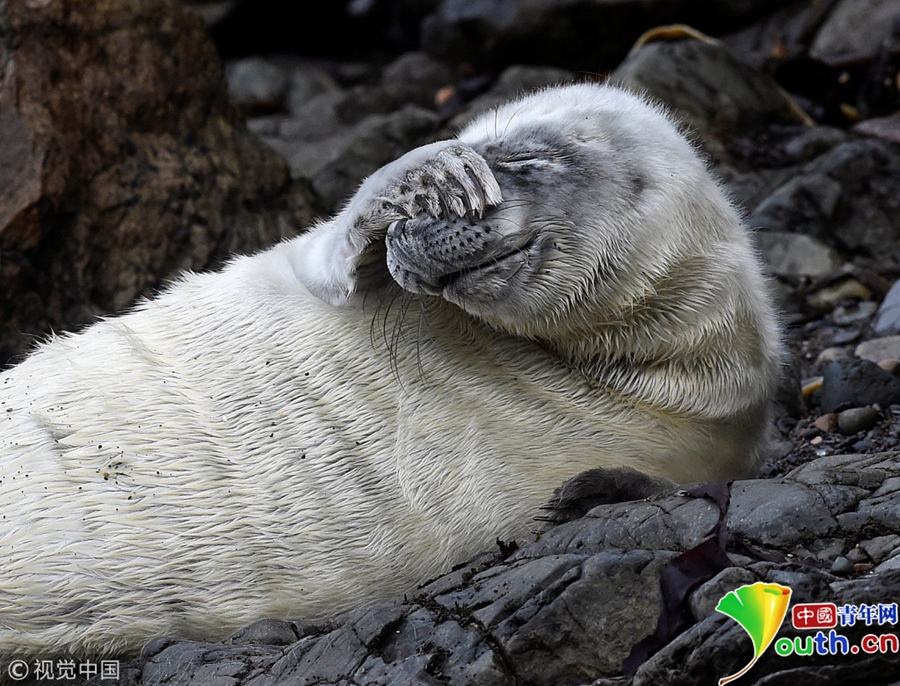 中國青年網(wǎng)北京10月9日電 當(dāng)?shù)貢r(shí)間2018年10月8日,英國彭布羅克郡,一只大西洋海豹幼崽躺在海邊礁石上。海豹幼崽出生時(shí)都有毛茸茸的白色非防水皮毛,它們會在第四周蛻皮。