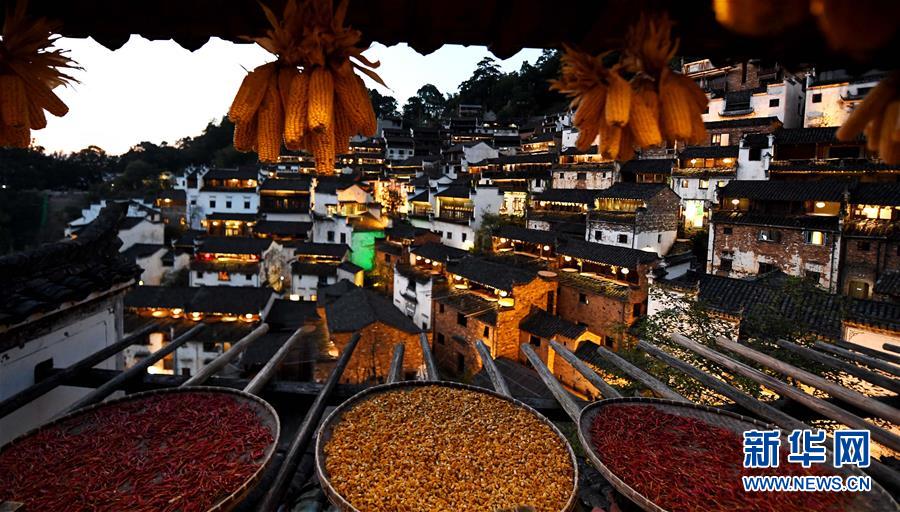 這是黃昏中的篁嶺古村(10月25日攝)。近日天氣晴朗,江西省婺源縣江灣鎮(zhèn)篁嶺村村民抓住時(shí)機(jī)采摘、晾曬皇菊及蔬果。明黃的菊花、火紅的辣椒……各種顏色將篁嶺古村裝扮成巨大的“調(diào)色板”,引來(lái)眾多游客感受鄉(xiāng)村美景。新華社記者宋振平 攝