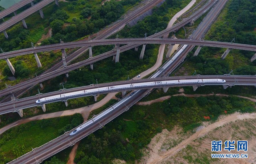 一列動(dòng)車在南寧市區(qū)行駛(9月4日無人機(jī)拍攝)。 廣西壯族自治區(qū)成立60年來,鐵路建設(shè)發(fā)生翻天覆地的變化。來自中國鐵路南寧局集團(tuán)有限公司的數(shù)據(jù)顯示,1958年廣西鐵路總里程為1346.3公里,如今廣西鐵路總里程達(dá)5191公里。廣西與周邊相鄰省份間實(shí)現(xiàn)動(dòng)車“公交化”開行。此外,北部灣港—重慶班列、東盟海產(chǎn)品冷鏈班列、“百色一號(hào)”果蔬專列等的開通和運(yùn)營,強(qiáng)化了鐵路供給的針對(duì)性和有效性。鐵路成為助推廣西經(jīng)濟(jì)社會(huì)快速發(fā)展的“大動(dòng)脈”。 新華社記者陸波岸攝