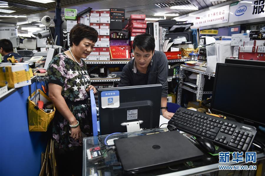 倪海真(左)到深圳華強(qiáng)北賽格電子市場五層的支部宣傳委員陳亞林柜臺(tái)前,與他溝通近期支部黨員學(xué)習(xí)的情況(2017年9月5日攝)。新華社記者毛思倩 攝 圖片來源:新華網(wǎng)