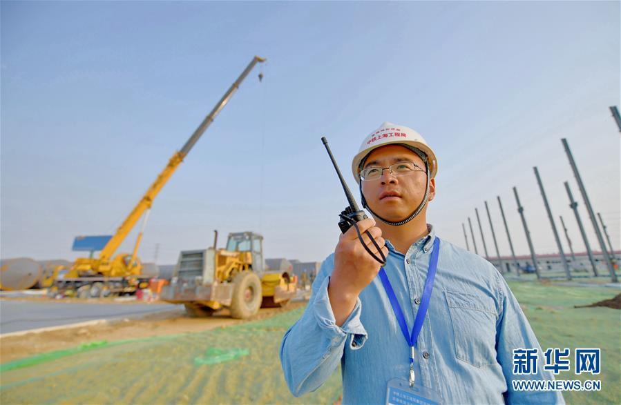4月26日,來自中鐵上海工程局京雄城際鐵路五標(biāo)二分部的工程師韓正順在京雄城際鐵路工程五標(biāo)段小型構(gòu)件預(yù)制廠場地建設(shè)現(xiàn)場用對(duì)講機(jī)指揮作業(yè)。新華社記者王曉 攝 圖片來源:新華網(wǎng)