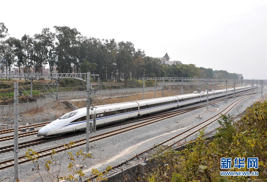 廣西桂林至北京高鐵列車在桂林市靈川縣境內(nèi)行駛(2013年12月28日攝)。 廣西壯族自治區(qū)成立60年來,鐵路建設(shè)發(fā)生翻天覆地的變化。來自中國鐵路南寧局集團(tuán)有限公司的數(shù)據(jù)顯示,1958年廣西鐵路總里程為1346.3公里,如今廣西鐵路總里程達(dá)5191公里。廣西與周邊相鄰省份間實(shí)現(xiàn)動(dòng)車“公交化”開行。此外,北部灣港—重慶班列、東盟海產(chǎn)品冷鏈班列、“百色一號(hào)”果蔬專列等的開通和運(yùn)營,強(qiáng)化了鐵路供給的針對(duì)性和有效性。鐵路成為助推廣西經(jīng)濟(jì)社會(huì)快速發(fā)展的“大動(dòng)脈”。 新華社記者陸波岸攝