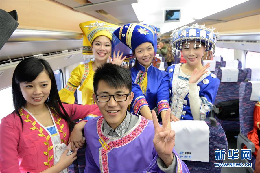 在廣西南寧站,身著民族服裝的乘客搭乘動(dòng)車準(zhǔn)備出行(2013年12月30日攝)。 廣西壯族自治區(qū)成立60年來,鐵路建設(shè)發(fā)生翻天覆地的變化。來自中國鐵路南寧局集團(tuán)有限公司的數(shù)據(jù)顯示,1958年廣西鐵路總里程為1346.3公里,如今廣西鐵路總里程達(dá)5191公里。廣西與周邊相鄰省份間實(shí)現(xiàn)動(dòng)車“公交化”開行。此外,北部灣港—重慶班列、東盟海產(chǎn)品冷鏈班列、“百色一號(hào)”果蔬專列等的開通和運(yùn)營,強(qiáng)化了鐵路供給的針對(duì)性和有效性。鐵路成為助推廣西經(jīng)濟(jì)社會(huì)快速發(fā)展的“大動(dòng)脈”。 新華社記者周華攝