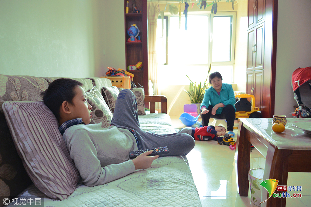 2018年11月3日,濟南,爬爬墊挨著沙發(fā),沙發(fā)上,8歲的大寶糖糖捧著手機,手機里是一個小游戲,糖糖看得很投入。圖片作者:易生