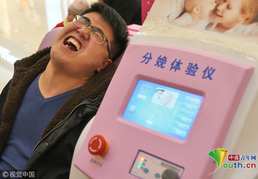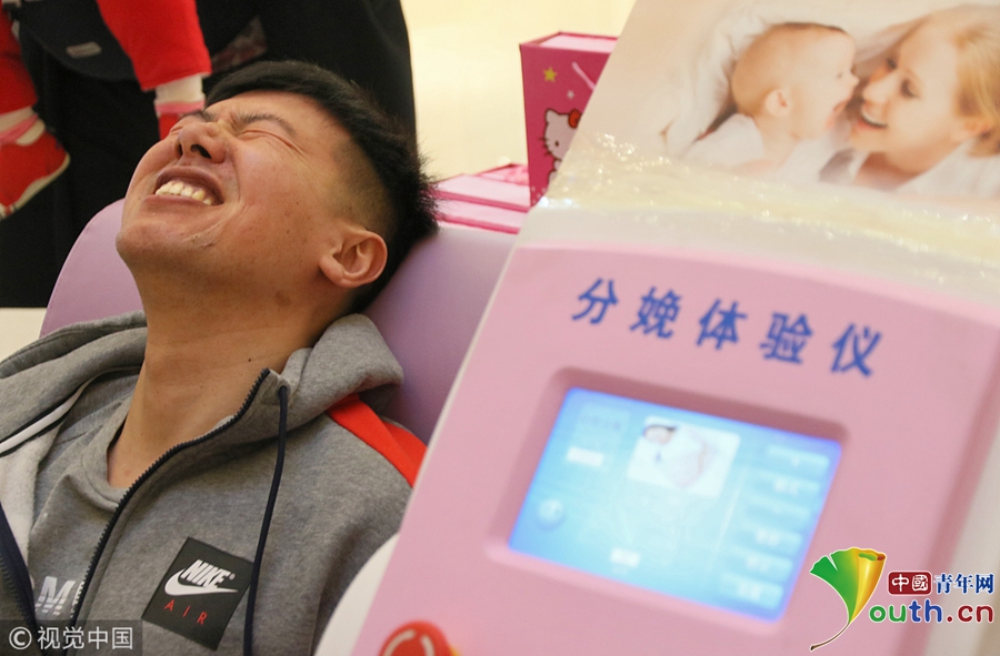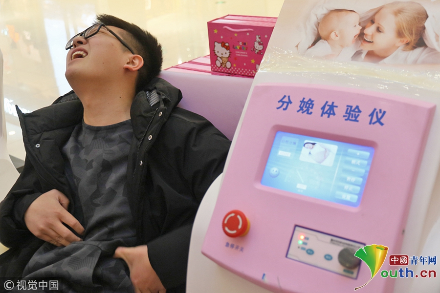 2018年3月8日,一名男士在山東煙臺大悅城通過“分娩體驗儀”感受“分娩”時的陣痛。
