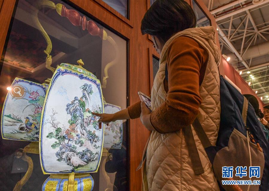11月23日,兩位參觀者在“博博會(huì)”上觀看文創(chuàng)產(chǎn)品。新華社記者李賀攝