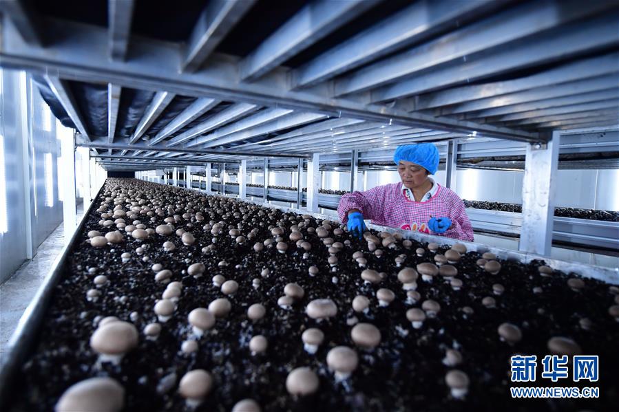 在河南蘭考縣東壩頭鄉(xiāng)張莊村,一位村民正在一個食用菌企業(yè)的車間內采摘褐蘑菇(6月21日攝)。新華社記者馮大鵬攝