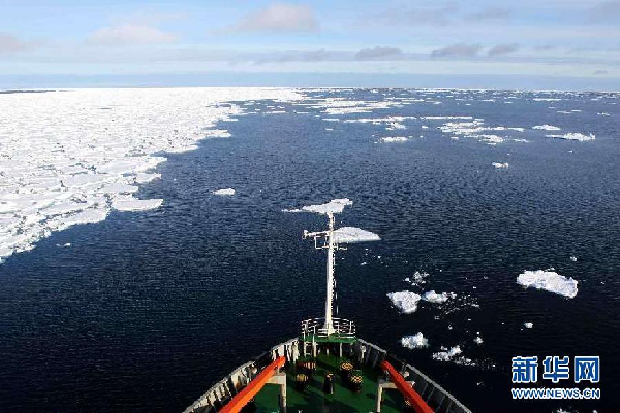 從“雪龍”號駕駛臺上放眼望去,浮冰鋪滿海面,時有冰山立于其間?!把垺碧栄刂”g的空隙行進(jìn),碾過浮冰的撞擊聲不時從船底傳來。為減輕船體的震動,航速有所下降,由原來的每小時15節(jié)左右降為目前的每小時9節(jié)左右(1節(jié)約合每小時航行1.852公里)。