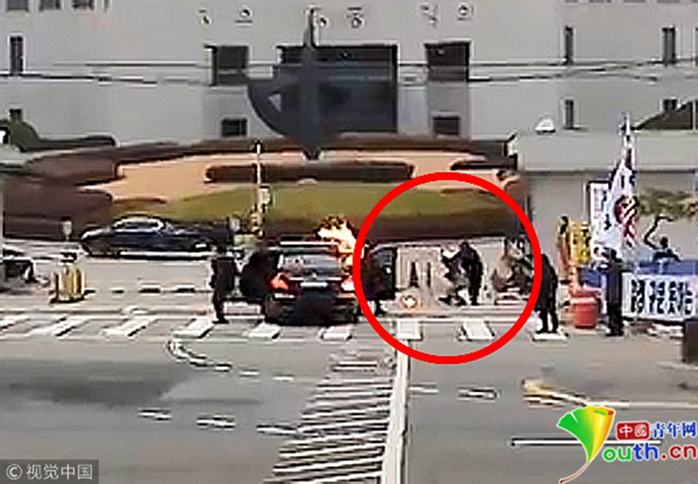 當?shù)貢r間2018年11月27日,韓國首爾,27日上午9點10分,在首爾瑞草區(qū)的最高法院前面,一名74歲的示威男子向韓國最高法院院長金明秀所乘的車輛投擲燃燒瓶。副駕駛一側(cè)的前輪和示威男子身上均起火,所幸被現(xiàn)場警察迅速撲滅,金明秀未受傷。當時,他正準備去上班。