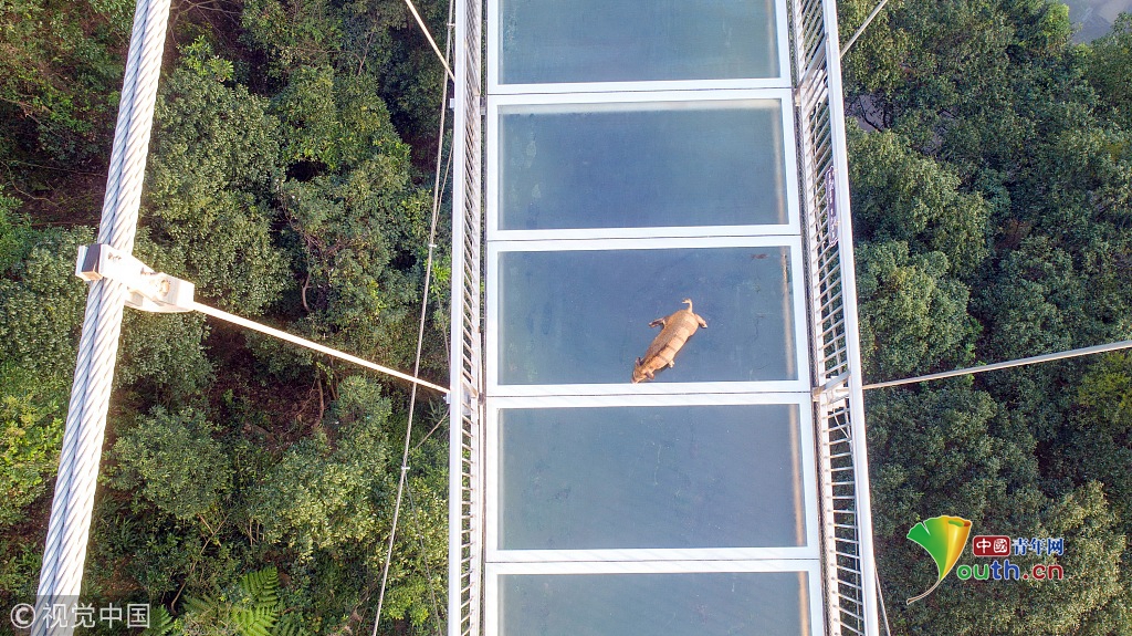 保安估計(jì)這只山豬是因?yàn)樵缟响F大誤闖入玻璃橋。估計(jì)是第一次上玻璃橋,不知道玻璃是何物,加上玻璃下面又是深不見底的大峽谷,山豬非常害怕,渾身發(fā)抖,趴在橋上不敢走動(dòng)。加上玻璃橋上有霧水,山豬后腿不停打滑,更將山豬嚇得沒了主意。
