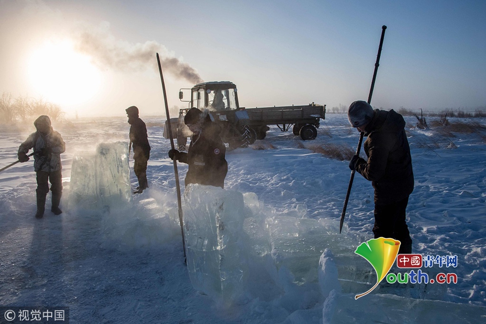 圖為村民將采集上來(lái)的冰塊裝車。