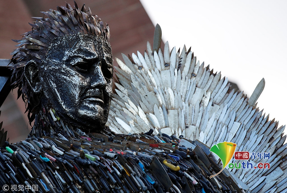 當?shù)貢r間2018年11月29日,英國利物浦,藝術家阿爾菲·布拉德利在圣公會教堂外用沒收的10萬多把刀具制作了一尊名為“刀之天使”的塑像。