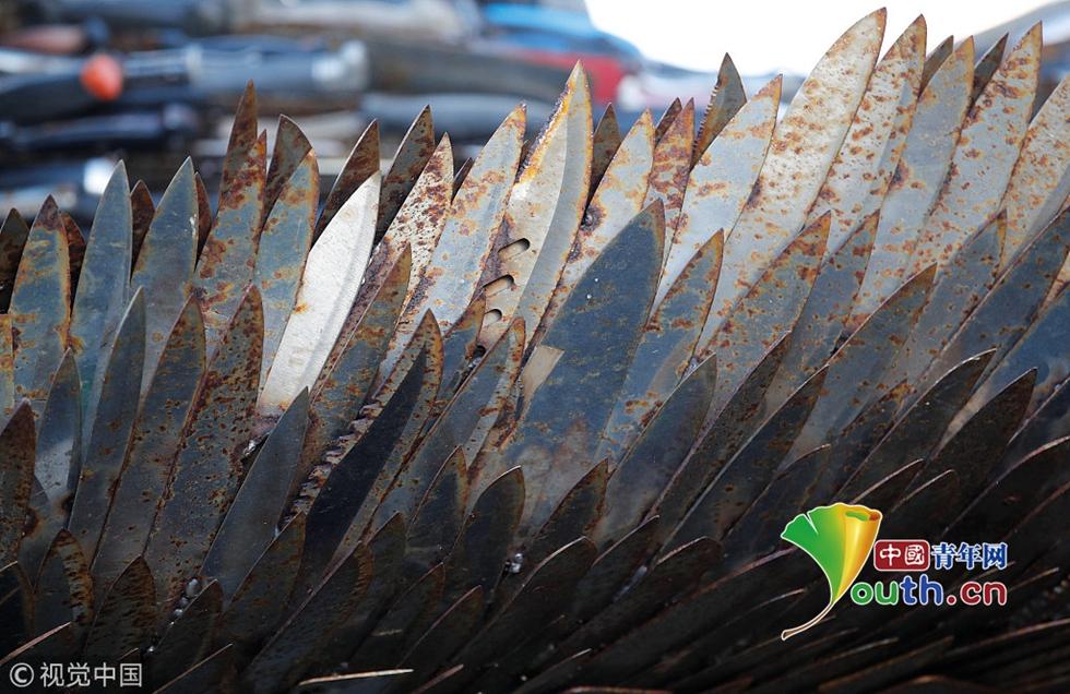 當(dāng)?shù)貢r(shí)間2018年11月29日,英國(guó)利物浦,藝術(shù)家阿爾菲·布拉德利在圣公會(huì)教堂外用沒收的10萬多把刀具制作了一尊名為“刀之天使”的塑像。