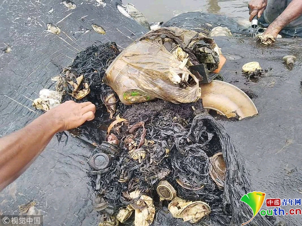 當?shù)貢r間2018年11月19日,印尼瓦卡托比,當?shù)匕l(fā)現(xiàn)一頭擱淺的鯨,肚子里滿是塑料垃圾。它的腹中有12斤塑料垃圾,其中包括115個杯子。
