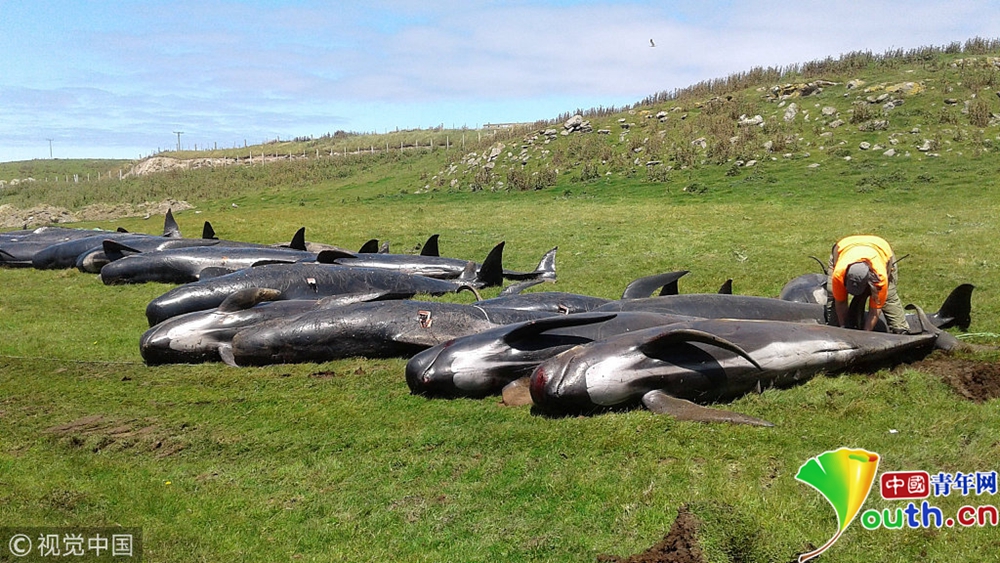 當?shù)貢r間11月30日,新西蘭查塔姆島,多頭巨頭鯨在當?shù)睾R淺死亡,尸體被沖上岸。