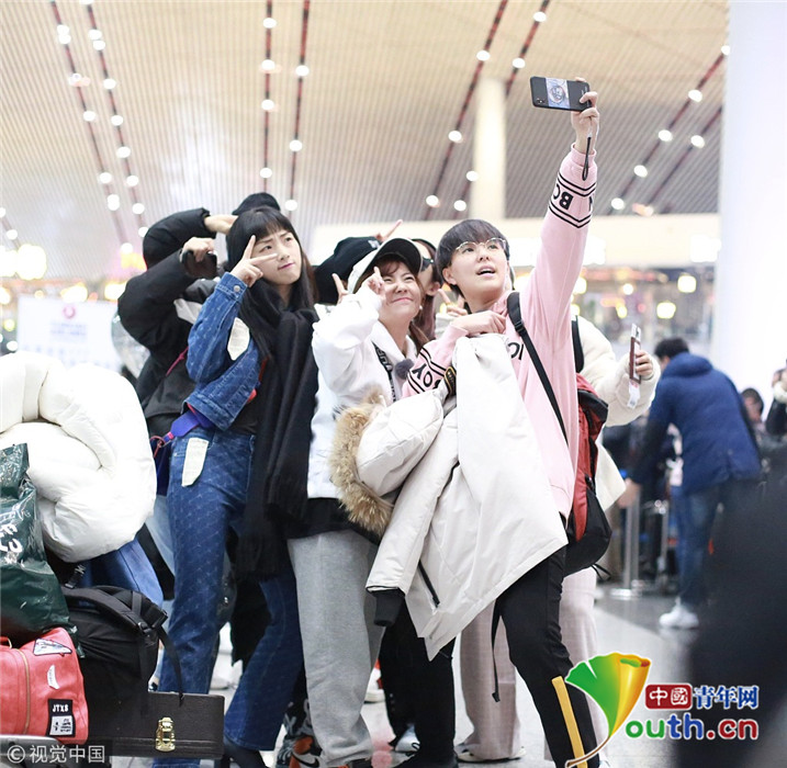 2018年12月3日,北京,“火箭少女101”全體成員現(xiàn)身機(jī)場前往國外錄制團(tuán)總綜。其中孟美岐戴著墨鏡,一身全黑運(yùn)動裝扮,大步流星氣場超強(qiáng),楊蕓晴、yamy、楊超越等成員緊隨其后,大家還一起在機(jī)場玩起自拍,好不歡樂。