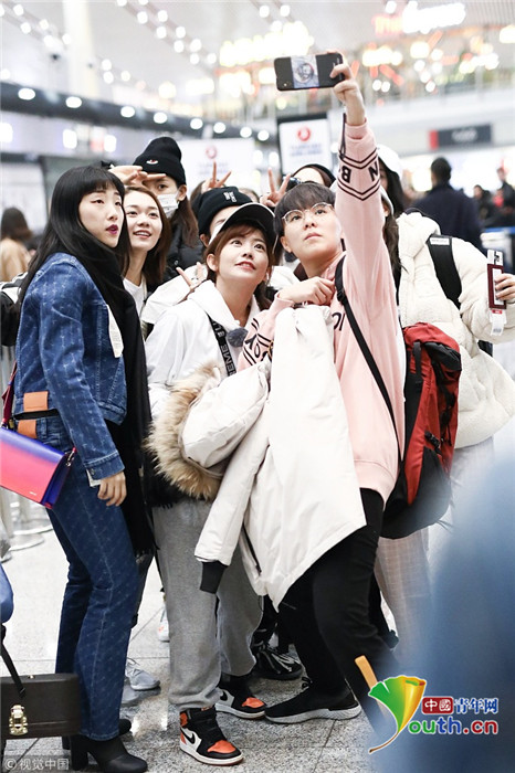 2018年12月3日,北京,“火箭少女101”全體成員現(xiàn)身機(jī)場(chǎng)前往國(guó)外錄制團(tuán)總綜。其中孟美岐戴著墨鏡,一身全黑運(yùn)動(dòng)裝扮,大步流星氣場(chǎng)超強(qiáng),楊蕓晴、yamy、楊超越等成員緊隨其后,大家還一起在機(jī)場(chǎng)玩起自拍,好不歡樂(lè)。