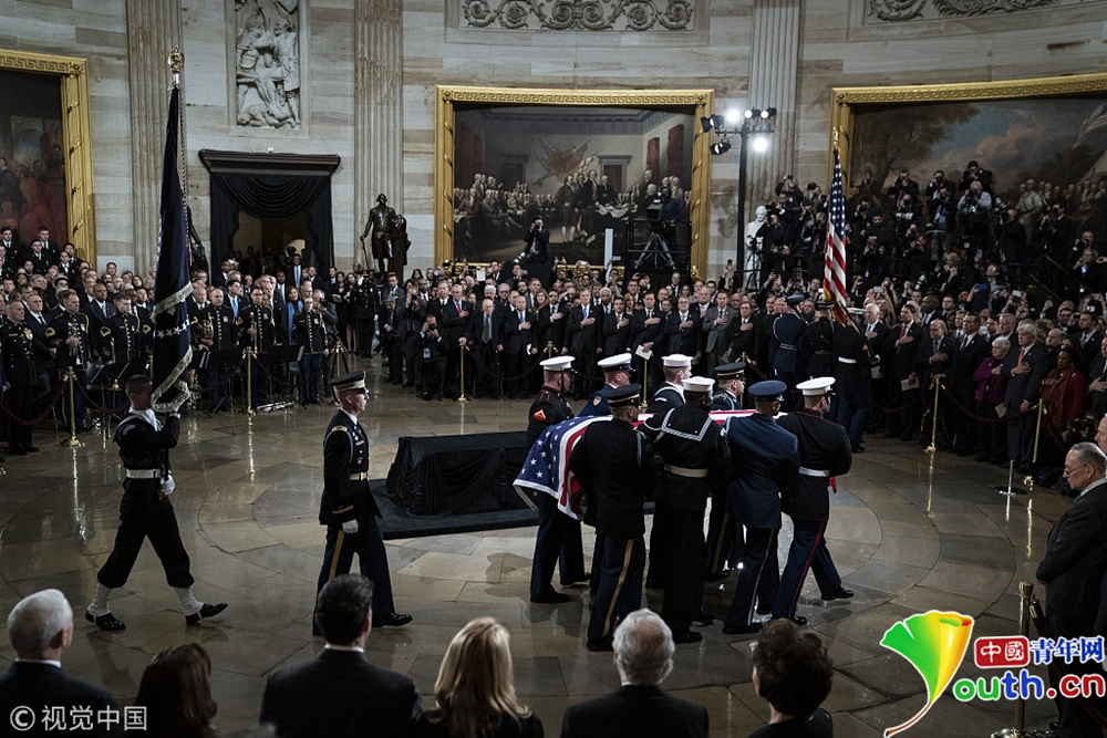 靈柩由一支軍事儀仗隊抬入圓形大廳,安置在1865年為林肯總統(tǒng)的棺材所建造的靈柩臺上。
