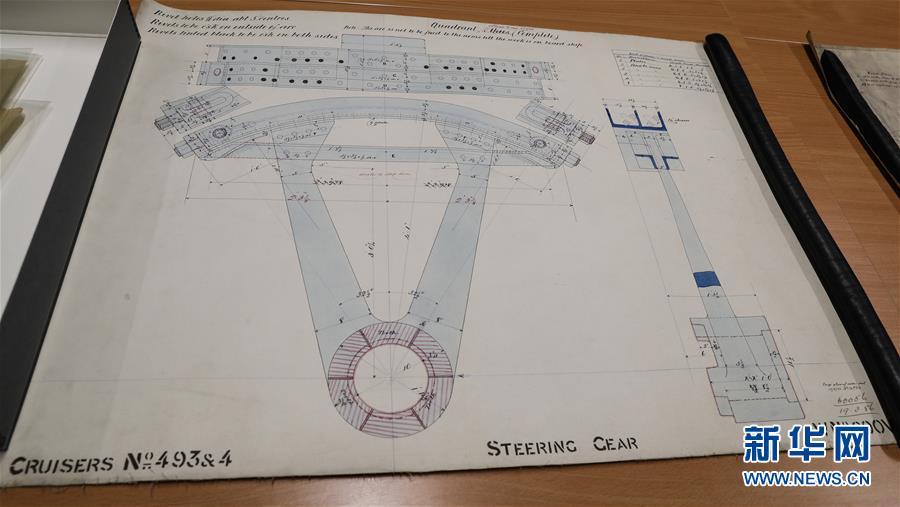 這是11月2日在英國紐卡斯?fàn)柕奶┒鳌枡n案館拍攝的致遠(yuǎn)艦設(shè)計圖紙。 新華社記者日前在紐卡斯?fàn)柼┒鳌枡n案館查找北洋海軍史料時發(fā)現(xiàn)一套七張、檔案名為“中國巡洋艦舵機(jī)設(shè)計圖”的原始圖紙。塵封百年,甲午海戰(zhàn)中抗擊日艦后沉沒的清北洋海軍致遠(yuǎn)艦部分原廠設(shè)計圖紙在其建造地——英國紐卡斯?fàn)柺械囊患覚n案館首次被發(fā)現(xiàn),為打撈那段悲壯的歷史提供了重要參考。 新華社記者 韓巖 攝
