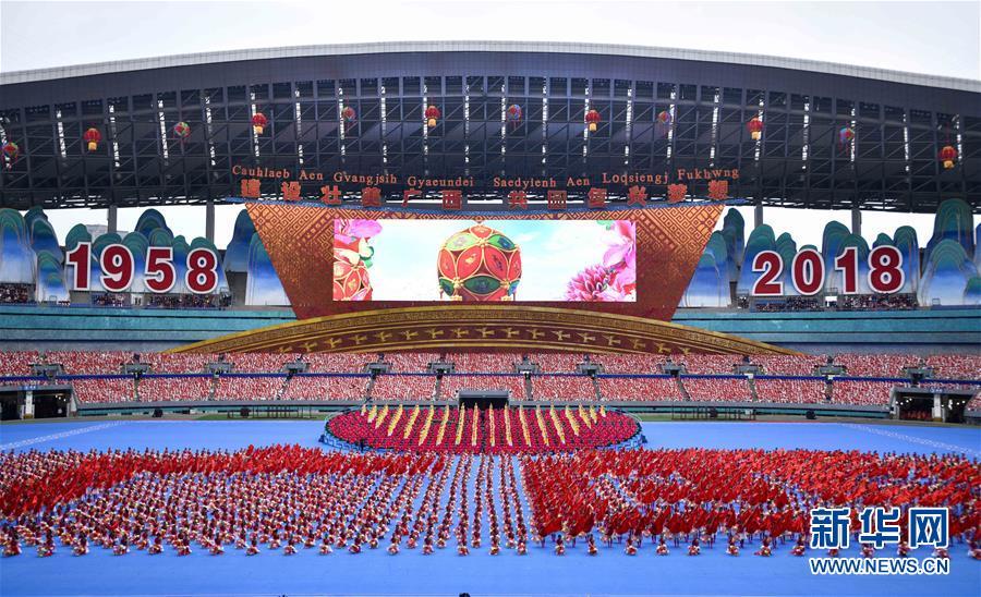 12月10日,廣西壯族自治區(qū)成立60周年慶祝大會(huì)在廣西體育中心隆重舉行。這是慶祝大會(huì)上的群眾文藝表演。 新華社記者 李學(xué)仁 攝
