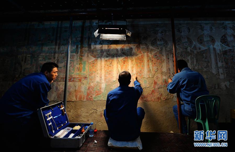 技術(shù)人員在莫高窟內(nèi)對病害壁畫進(jìn)行修復(fù)(2014年9月3日攝)。 敦煌記錄歷史。開放的胸襟,曾讓這里成為古代絲綢之路上“華戎所交一都會”。 時隔千年,改革開放的春風(fēng)吹入西北內(nèi)陸小城,敦煌再度成為中國對外開放的文化前沿。 新華社記者 陳斌 攝
