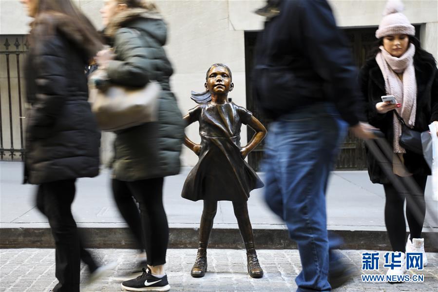 12月10日,在美國紐約,人們從紐約證券交易所前的“無畏女孩”銅像旁走過。 新華社記者 王迎 攝