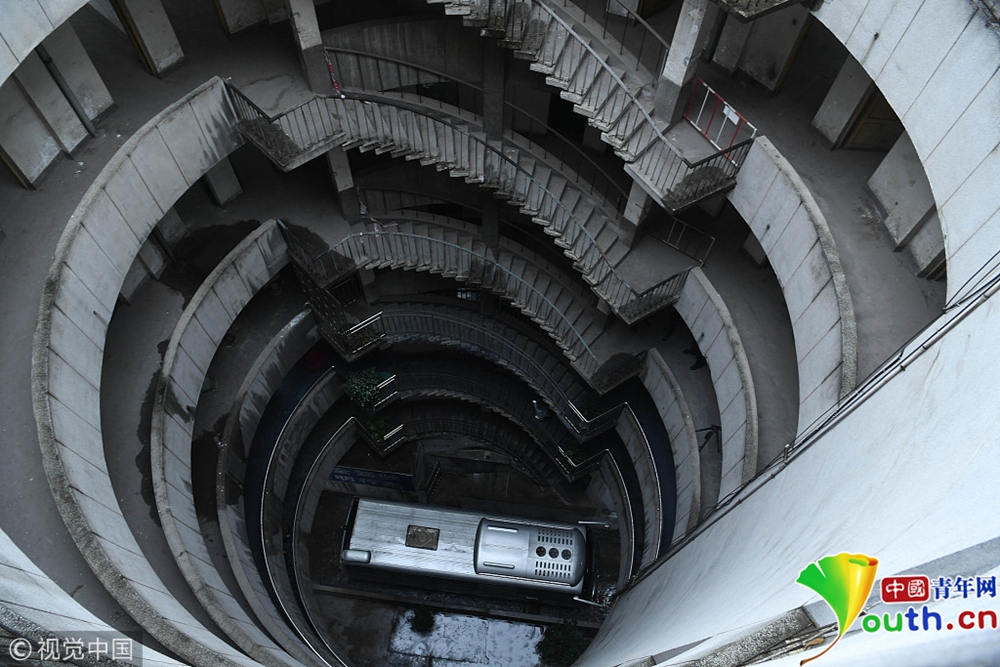 重慶洋人街景區(qū)內(nèi)的穿樓觀光索道吸引不少游客體驗。據(jù)悉,跨度長1000米的觀光索道將隨著洋人街的拆遷而搬離。中新社記者陳超 攝 2017年9月27日,重慶,南岸區(qū)某小區(qū)的“螺旋”停車場,從公路到車庫要下5層樓,司機需要轉(zhuǎn)無數(shù)個360度圈。圖片來源:視覺中國