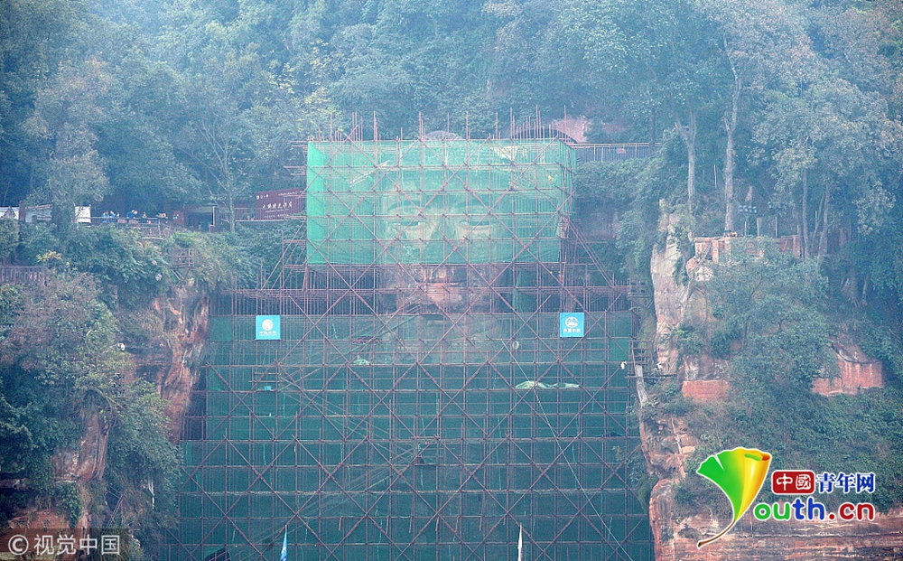 12月13日,四川樂山大佛周圍搭建腳手架已經到達大佛頭部,10多名工人穿梭于搭建的腳手架之間,工人用綠色防護網(wǎng)繞腳手架將大佛圍住。從2018年10月8日截至今日,經過66天的緊張施工,用了近兩千根6米長鋼管搭建腳手架,搭建的腳手架總重量達45噸,鋼管的總長度加起來達到11700米,而圍在腳手架外的防護網(wǎng)則使用了2000平方米左右。目前,包括頭部在內的樂山大佛本體已被全部遮蔽。