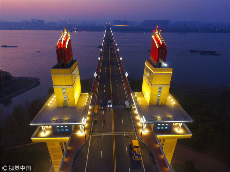 2018年12月13日,江蘇南京,“一橋飛架南北,天塹變通途?!弊鳛槲覈谝蛔孕性O(shè)計(jì)和建造的雙層鐵路、公路兩用橋,南京長江大橋在我國橋梁史上的重要地位不言而喻。從1968年建成后的48年間,它就如同一條巨龍,始終在長江上默默守護(hù)著人來車往。南京長江大橋上層是公路橋,下層為雙軌復(fù)線鐵路橋,連接津浦鐵路與滬寧鐵路干線,是我國南北交通要津和命脈。近年來,由于南京長江大橋公路橋的實(shí)際通行荷載遠(yuǎn)超原先設(shè)計(jì)標(biāo)準(zhǔn),不僅橋面上擁堵常現(xiàn),橋梁本身的種種“病害”也日益加深。圖為2018年12月13日,夜幕降臨,南京長江大橋歸位后的玉蘭花燈重新點(diǎn)亮。大橋玉蘭花燈柱共有299根,每根燈柱上有5盞玉蘭花燈,1大4小,一共1495盞。方東旭/視覺中國