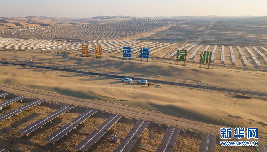 位于庫布其沙漠腹地的達(dá)拉特光伏發(fā)電應(yīng)用領(lǐng)跑基地一期500兆瓦項目(12月13日無人機(jī)拍攝)。 新華社記者 彭源攝