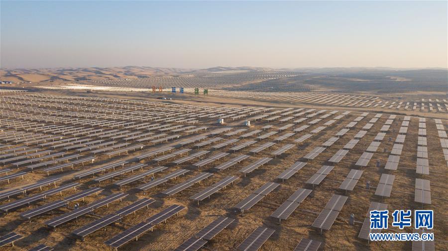位于庫布其沙漠腹地的達拉特光伏發(fā)電應(yīng)用領(lǐng)跑基地一期500兆瓦項目(12月13日無人機拍攝)。 新華社記者 彭源攝